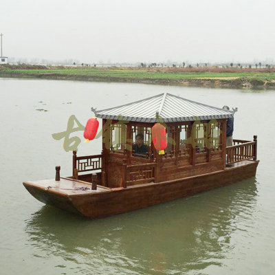 畫舫船就是裝飾古典華麗的游船,是"中國風"的仿古游船,結合古典園林建筑,體現了中華文明的古典藝術.畫舫船豪華而又古典,船上的建筑按照中國古代建筑里的亭臺樓閣,建筑工藝之復雜,要求之嚴格,仿古畫舫游船的特點飛檐翹角、玲瓏精致的四角亭子逐漸成形,赫然立于船頭,美人靠、盤龍柱子、彩畫……龍柱上的浮雕盤龍和祥云一層扣著一層,層層錯落有致,雕刻精細到盤龍身上的每一個鱗片都細細可數,古代皇家標志性元素,在畫舫船上體現的淋漓盡致。除了雕刻、花窗,整條船還有一個看點,那就是弧線優美、高高翹起的船尾。游船并不大,長約10米、寬3米,但是整體看起來堪稱一件藝術品。船尾的雕花欄桿與船艙、船頭的雕刻遙相呼應,船身四周貼著浮雕祥云,給整條船增添了富貴、華麗的氣質。